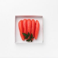 原材料名:すけとうだらの卵巣(米国またはロシア)、食塩、焼酎、発酵調味料、たん白加水分解物、唐辛子、かつお魚醤、かつお節エキス、還元麦芽糖、いわし魚醤/甘味料(ソルビット)、調味料(アミノ酸等)、酸化防止剤(V.C)、酵素、着色料(赤102、黄5、赤3)、発色剤(亜硝酸Na)、(一部に大豆・ゼラチンを含む)